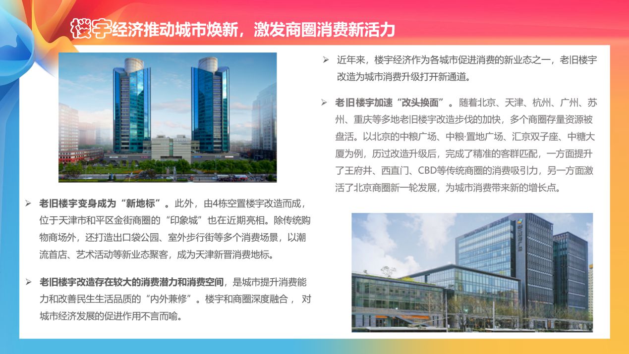 老舊樓宇改造存在較大的消費潛力和消費空間,是城市提升消費能力和改善民生生活品質的“內外兼修”。《報告》梳理指出,隨著北京、天津、杭州、廣州、蘇州、重慶等多地老舊樓宇改造步伐的加快,多個商圈存量資源被盤活。以北京的中糧廣場、中糧·置地廣場、匯京雙子座、中糖大廈為例,通過舊改提升、輕(中)資產輸出等方式,打造高端商務地標,完成了精準的客群匹配,一方面提升了王府井、西直門、CBD等傳統商圈的消費吸引力,另一方面激活了北京商圈新一輪發展,推動片區重構和能級提升,為城市消費帶來新的增長點。