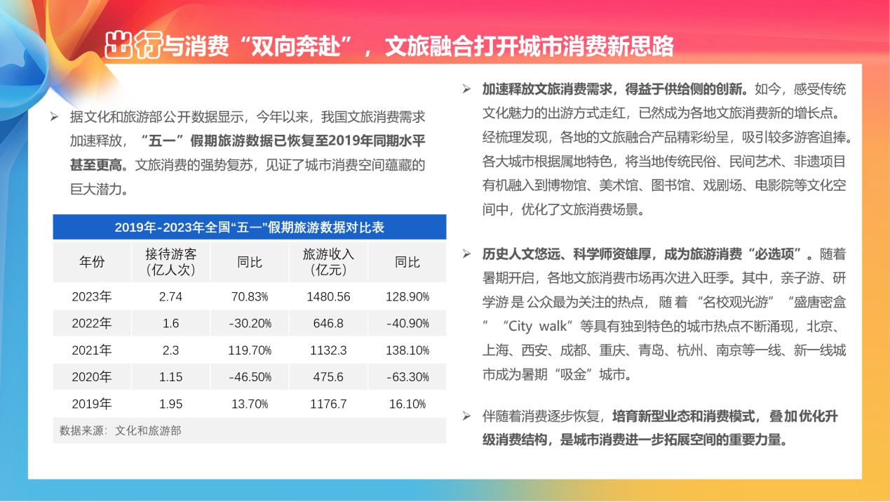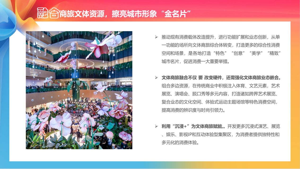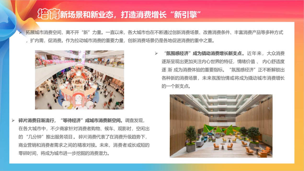 《報告》認為,推動現有消費載體改造提升,進行功能擴展和業態創新,從單一功能的場所向文體商旅綜合體轉變,打造更多的綜合性消費空間和場景,是各地打造“特色”“創意”“美學”“精致”城市名片,促進消費一大重要舉措。