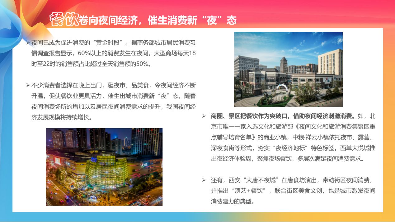在餐飲消費方面,隨著夜間消費場所的增加以及居民夜間消費需求的提升,我國夜間經濟發展規模將持續增長。例如,北京市唯一一家入選文化和旅游部《夜間文化和旅游消費集聚區重點輔導培育名單》的商業小鎮,中糧·祥云小鎮依托夜市、露營、深夜食街等形式,構建了“商圈+生活圈+夜經濟”的消費重地,榮獲北京十大商業品牌、消費季品牌榜“十大文化消費地標”。西安“大唐不夜城”在唐食坊演出,帶動街區夜間消費,并推出“演藝+餐飲”,聯合街區美食文創,也是城市激發夜間消費潛力的典型。《報告》認為,隨著夜間消費場所的增加以及居民夜間消費需求的提升,我國夜間經濟發展規模將持續增長。