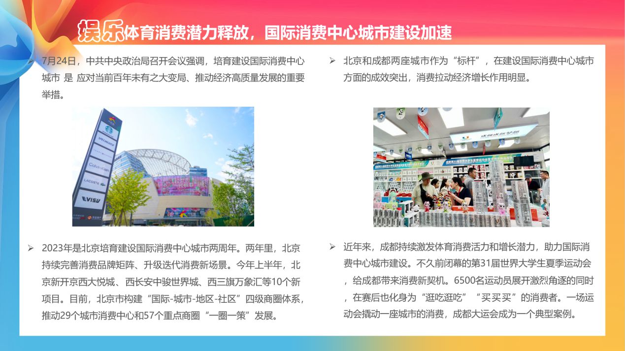 在娛樂體育消費方面,北京、成都兩座城市作為“標桿”,在建設國際消費中心城市方面的成效突出,消費拉動經濟增長作用明顯。以北京為例,2023年是北京培育建設國際消費中心城市兩周年。兩年里,北京持續完善消費品牌矩陣、升級迭代消費新場景。今年上半年,北京新開京西大悅城、西長安中駿世界城、西三旗萬象匯等10個新項目。目前,北京市構建“國際-城市-地區-社區”四級商圈體系,推動29個城市消費中心和57個重點商圈“一圈一策”發展。