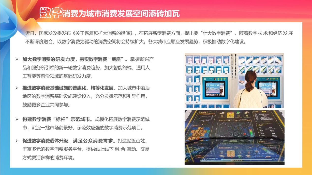 《報告》基于政府部門及行業協會公開信息、大數據技術應用和智能化平臺數據、相關學術文獻、媒體報道、消費者反饋等數據信息,從城市消費現狀與趨勢、消費業態和場景創新、消費空間拓展三個維度進行綜合分析,并提出針對性建議舉措,以期助力各城市、各企業培育消費新增長點,開拓多樣化消費業態,釋放和激發出更大的消費潛能,增強經濟高質量發展的內生動力。