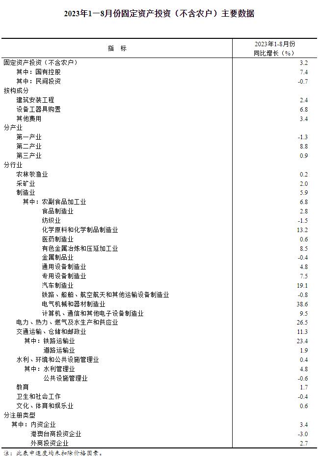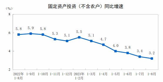 國家統計局:2023年1—8月份全國固定資產投資增長3.2%