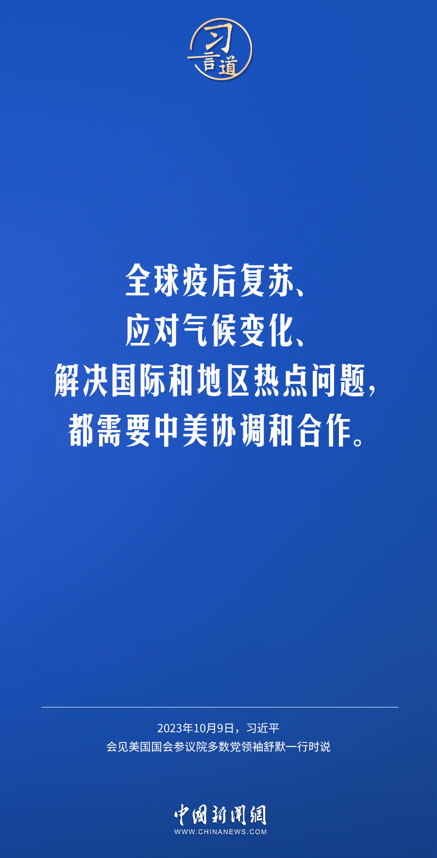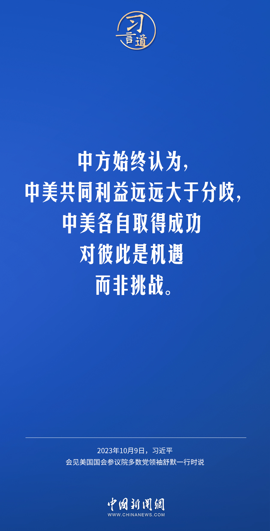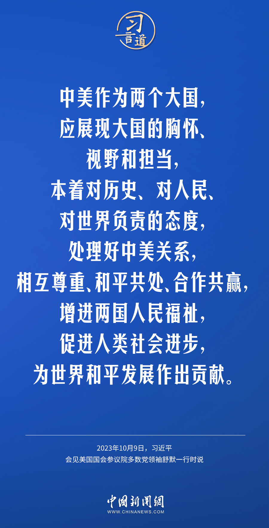 10月9日下午,國家主席習近平在人民大會堂會見美國國會參議院多數黨領袖舒默率領的美國國會參議院兩黨代表團。習近平指出——