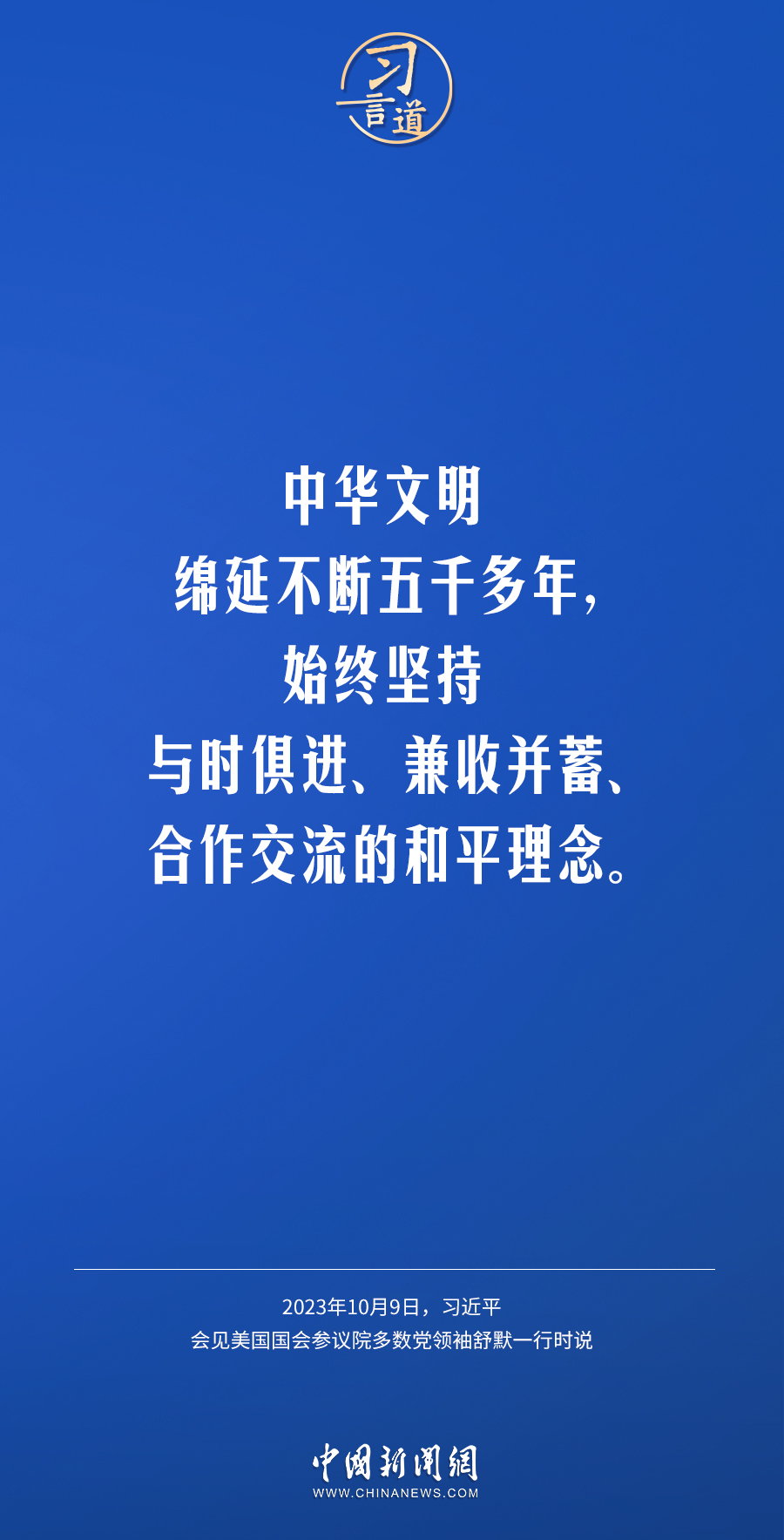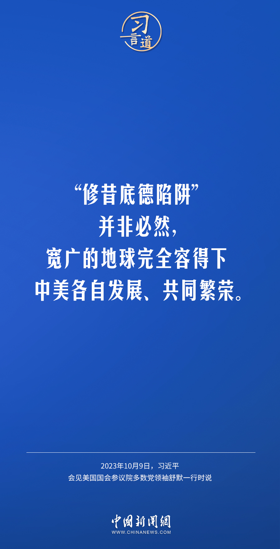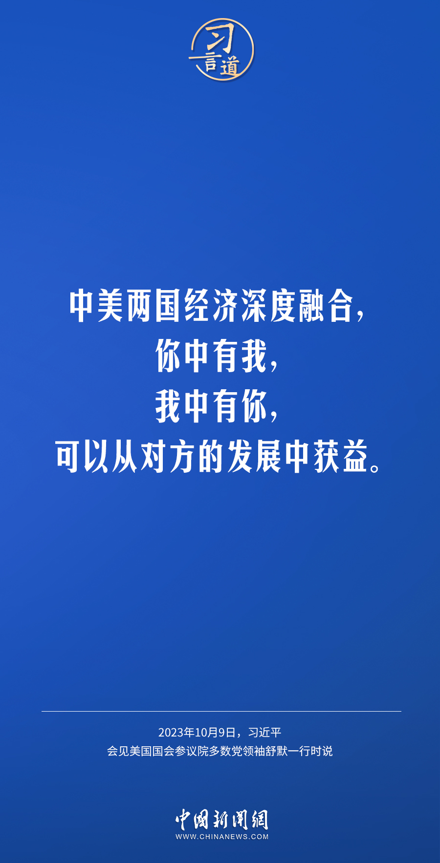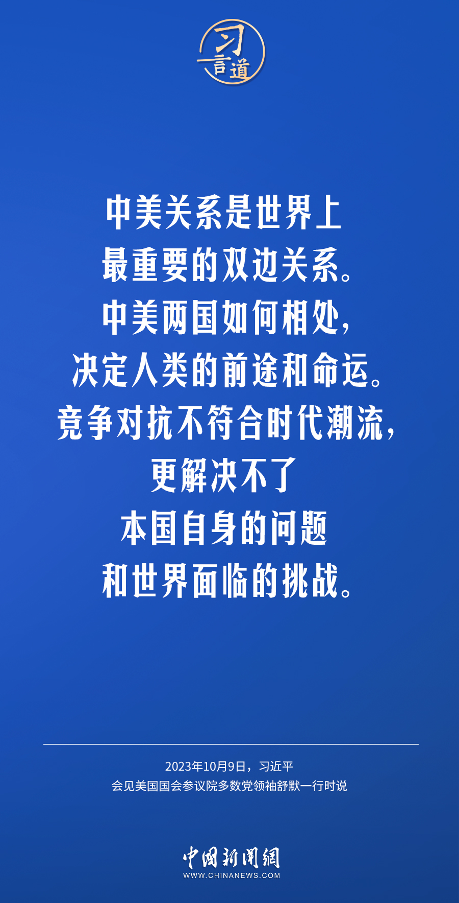 10月9日下午,國家主席習近平在人民大會堂會見美國國會參議院多數黨領袖舒默率領的美國國會參議院兩黨代表團。習近平指出——