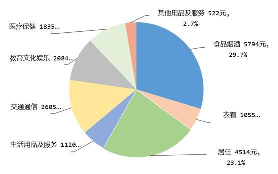 前三季度,全國居民人均食品煙酒消費支出5794元,增長6.7%,占人均消費支出的比重為29.7%;人均衣著消費支出1055元,增長6.5%,占人均消費支出的比重為5.4%;人均居住消費支出4514元,增長6.4%,占人均消費支出的比重為23.1%;人均生活用品及服務消費支出1120元,增長7.4%,占人均消費支出的比重為5.7%;人均交通通信消費支出2605元,增長11.3%,占人均消費支出的比重為13.3%;人均教育文化娛樂消費支出2084元,增長16.4%,占人均消費支出的比重為10.7%;人均醫療保健消費支出1835元,增長15.0%,占人均消費支出的比重為9.4%;人均其他用品及服務消費支出522元,增長17.4%,占人均消費支出的比重為2.7%。