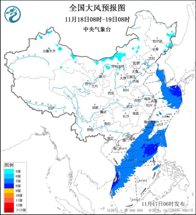 11月17日08時至18日08時,內蒙古中東部、東北大部、河北北部、山東半島東部等地將有5~6級、陣風7~8級的大風;渤海、渤海海峽、黃海大部海域、東海大部海域、臺灣海峽、臺灣以東洋面、巴士海峽、南海大部海域將有7~8級、陣風9~10級的大風。11月18日08時至19日08時,內蒙古中東部、黑龍江東部、吉林東部等地將有5~6級、陣風7~8級的大風;黃海東部海域、東海東北部海域、臺灣海峽、臺灣以東洋面偏南海域、巴士海峽、南海大部海域將有7~8級、陣風9~10級的大風。中央氣象臺11月17日06時繼續發布大風藍色預警。