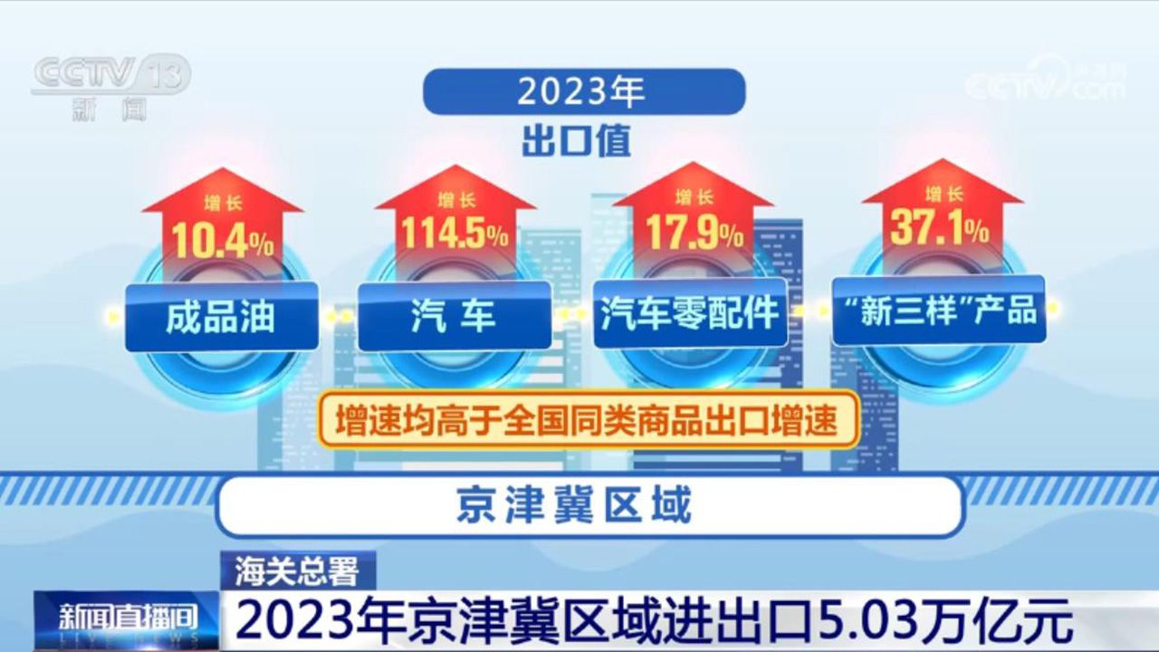 在出口方面,2023年京津冀區域出口1.31萬億元,增長2.5%,占全國出口總值的5.5%,其中,成品油、汽車、汽車零配件、“新三樣”產品的出口值分別增長10.4%、114.5%、17.9%、37.1%,增速均高于全國同類商品出口增速。