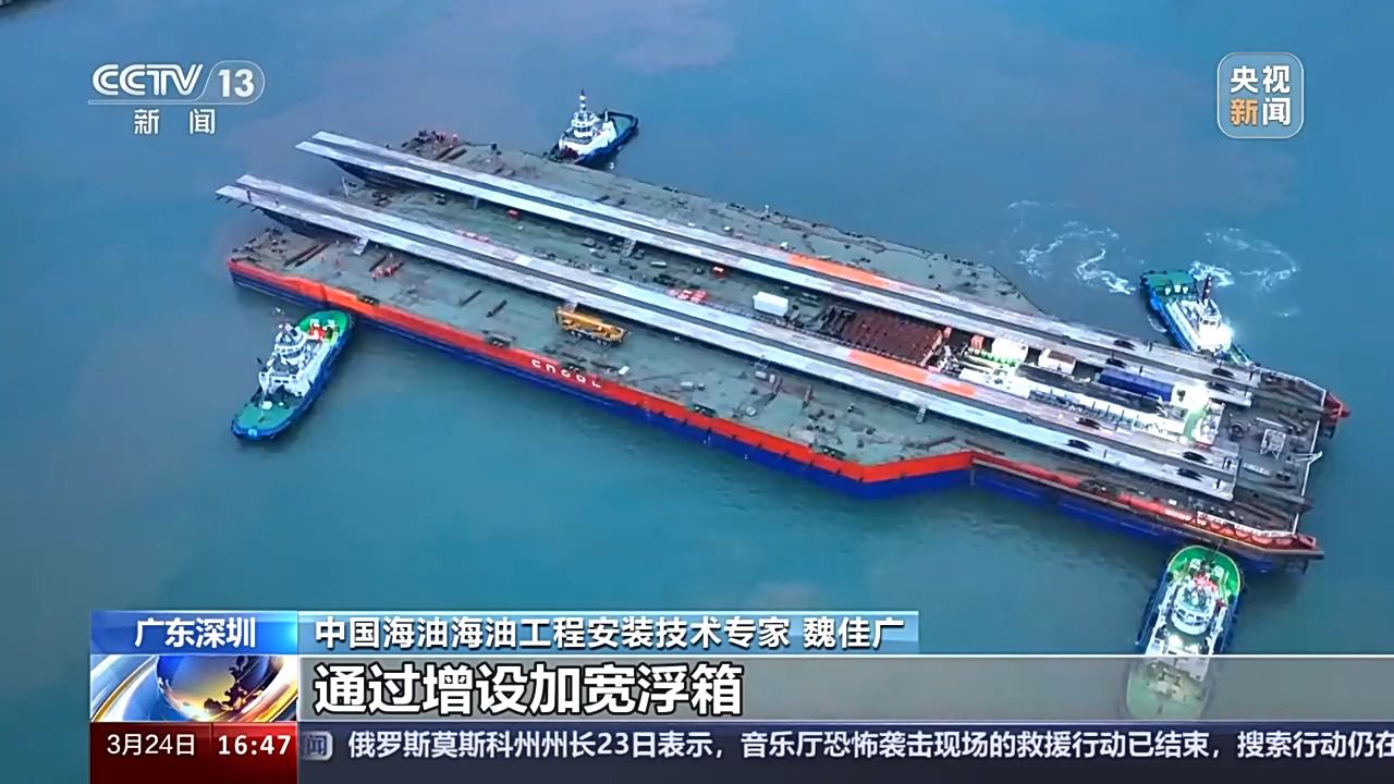 總臺央視記者 古峻嶺:這里是位于深圳東南方向240多公里處的流花油田海域,我們現在看到的這個大家伙,就是搭乘亞洲最大下水駁船——海洋石油229的海基二號深海導管架。它相當于海上平臺穩穩矗立在海底的“大長腿”,用鋼量接近于一整個“鳥巢”國家體育館。它是從廣東珠海出發,經過40多個小時的長距離拖航,剛剛抵達這一片施工海域。目前正在進行海上安裝前最后的準備工作。