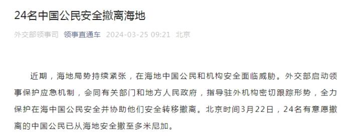 中新網3月25日電 據外交部領事司微信公眾號“領事直通車”25日消息,近期,海地局勢持續緊張,在海地中國公民和機構安全面臨威脅。外交部啟動領事保護應急機制,會同有關部門和地方人民政府,指導駐外機構密切跟蹤形勢,全力保護在海中國公民安全并協助他們安全轉移撤離。北京時間3月22日,24名有意愿撤離的中國公民已從海地安全撤至多米尼加。