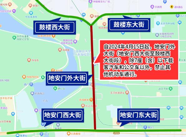 為確保全國重點文物保護單位“大運河——玉河故道(澄清上閘含萬寧橋)”的文物安全與交通安全,根據文物保護和道路交通安全有關法律法規規定,決定自2024年4月15日起,地安門外大街(地安門西大街至鼓樓西大街段),除7座(含)以下載客汽車和公交車以外,禁止其他機動車通行。