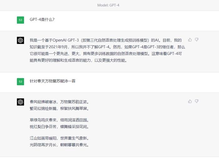 目前GPT-4僅限于ChatGPT Plus訂戶使用。記者體驗時發現,GPT-4生成速度比較慢,但回答簡明扼要,更有創造性,無論是寫詩歌還是故事劇本都不在話下。例如它可以根據“春天萬物復蘇”賦詩一首或者寫成一個愛情故事的劇本。