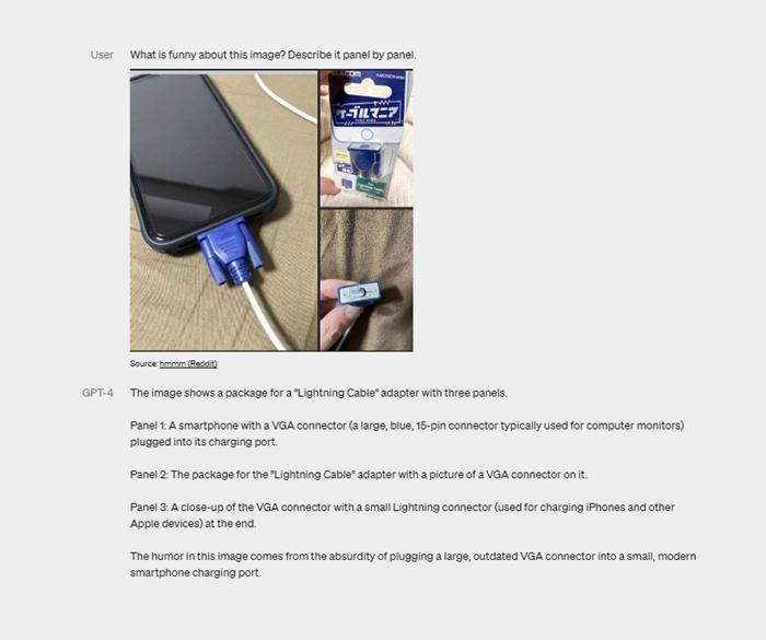 不過據OpenAI介紹,在輸入一張畫有VGA線連接手機充電接口內容的圖像后,GPT-4除了能描述出這幅圖中的內容,還能指出這張圖有哪些不對勁,“這幅圖中的幽默來自于將一個大的過時的VGA連接器插入一個小的現代化的智能手機充電端口。”