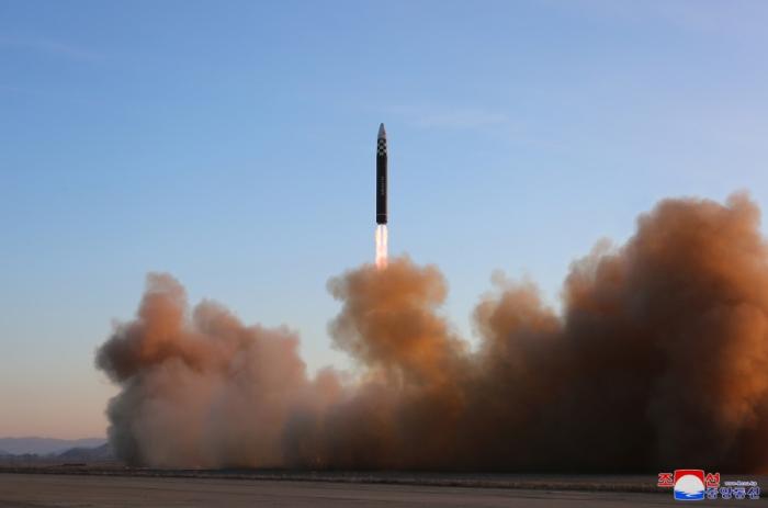 據報道,16日,“火星-17”型洲際彈道導彈在平壤國際機場發射,上升高度為6045公里,飛行距離達1000.2公里,飛行時間為4151秒,最后準確落在朝鮮東海目標水域。