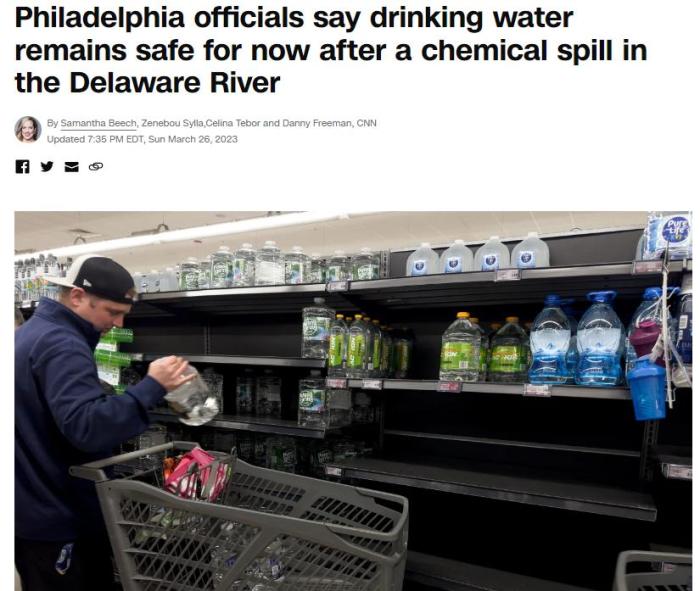 中新網3月27日電 綜合外媒報道,近日,美國賓州布里斯托爾一家工廠發生泄漏事故,大量化學物質流入特拉華河一條支流中。事故發生后,費城官員建議當地民眾使用瓶裝水,引發恐慌性購買。