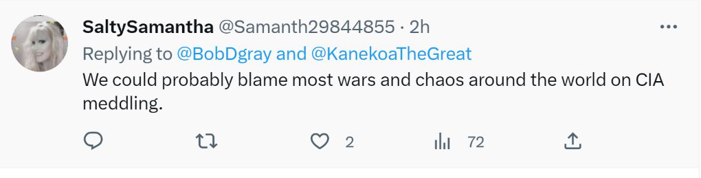 網友“有趣的薩曼莎”說:“世界上絕大多數的戰爭和混亂都是美國中央情報局帶來的吧。”
