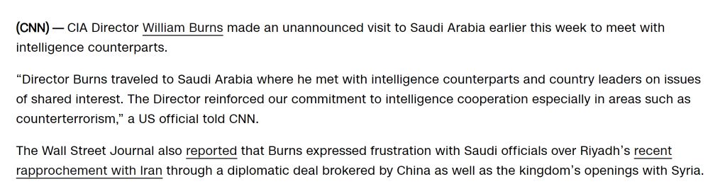 據美國有線電視新聞網報道,伯恩斯與沙特高級官員討論了“共同利益”,包括情報合作和反恐等問題。《華爾街日報》文章稱,伯恩斯對沙特接受中國斡旋與伊朗復交、沙特與敘利亞走近等表示“失望”“錯愕”,重申伊朗和敘利亞仍處于美國的制裁中。