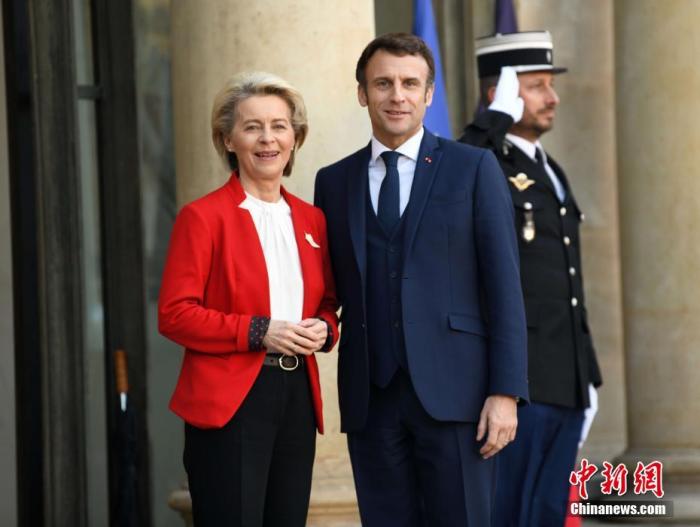 資料圖:法國總統馬克龍與歐盟委員會主席馮德萊恩。中新社記者 李洋 攝