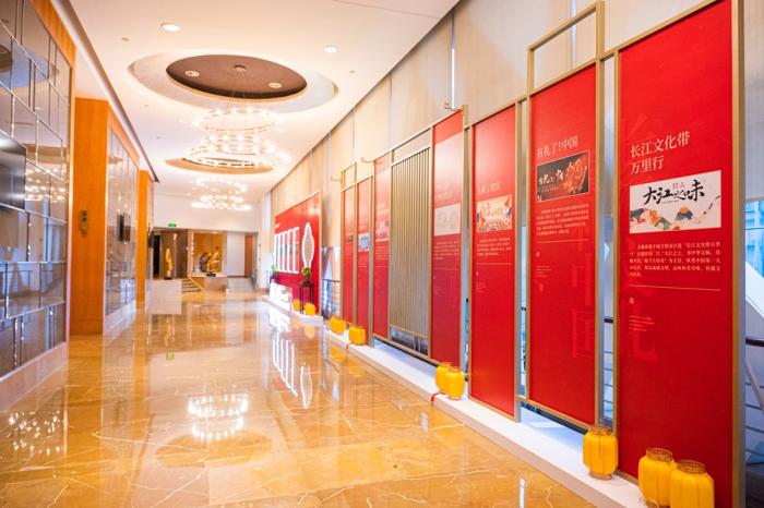 在賡續傳承板塊,五糧液借酒店中式大堂營造千年酒文化沉浸式氛圍感,以川西古建筑風格打造嘉賓簽到處,風格鮮明,不拘一格,墻上循環播放的五糧液品牌宣傳片,深入人心;由九龍壇、501五糧液、經典五糧液、第八代五糧液以及和美中國、五福熊貓等重磅產品合力打造的產品展臺位于酒店大堂C位中央,如眾星捧月般奪人眼球;不斷旋轉的展臺,確保觀展者可以從不同角度欣賞產品,提升產品觀賞性;四周環繞的展柜,展示著從第一代到第八代五糧液,不斷賡續傳承的品牌發展歷程,娓娓道來每一款時代經典背后濃墨重彩的五糧液發展篇章。