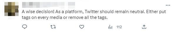 對推特的最新變化,有網友表示歡迎。“一個明智的決定!作為一個平臺,推特應該保持中立。要么給每個媒體上都打標簽,要么刪除所有標簽。”