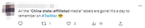 有網友稱,“所有‘中國官方媒體’的標簽都消失了!這是推特上值得紀念的一天。”