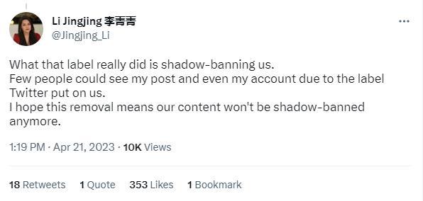 中國英文主持人李菁菁指出,推特的“官媒”標簽實際是一種“影子禁令”,為暗中設限提供方便。“由于推特給我們貼上了標簽,很少有人能看到我的帖子,甚至很難找到我的賬號。我希望這次刪除(標簽)意味著我們發布的內容不會再被暗中禁止。”