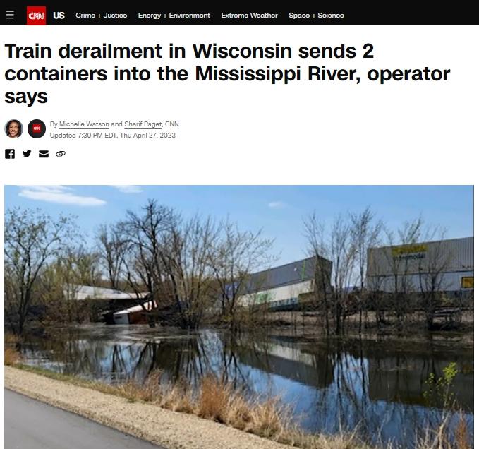 中新網(wǎng)4月28日電 據(jù)美國(guó)有線(xiàn)電視新聞網(wǎng)(CNN)報(bào)道,當(dāng)?shù)貢r(shí)間27日,一列火車(chē)在美國(guó)威斯康星州西南部脫軌,多節(jié)車(chē)廂掉入附近的密西西比河。
