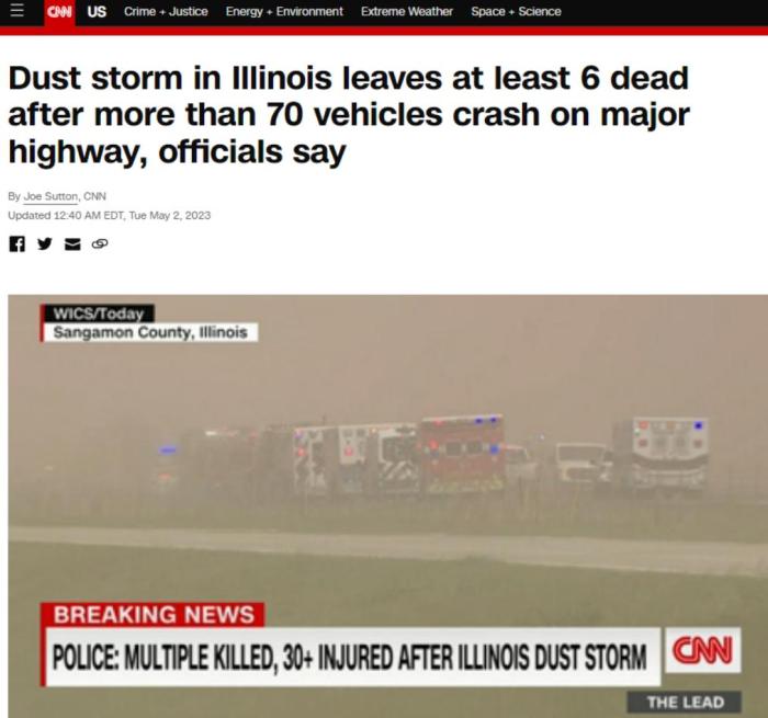 另據美國“ABC7”電視臺報道,有事故的目擊者稱,“感覺(事故區域)就像一個戰區”。途經的司機內森·科米爾表示,正確的做法是把車開到路邊,等沙塵消散,“如果我沒有挪到左邊的車道,恐怕早就被后面兩輛紅色的轎車撞死了。”