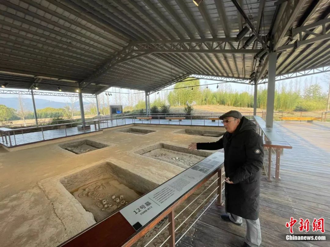 王明達在良渚遺址公園內講述當年考古工作的場景。張煜歡攝