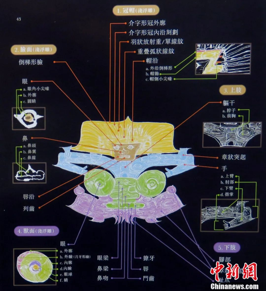這個圖案的主體為“神人”,面部呈倒梯形,眼睛、鼻子、牙齒都非常寫實。“神人”頭上還戴有高聳的羽冠,內層刻有連續(xù)卷云紋的帽飾,外層為放射狀羽翎大冠。“神人”的四肢都以陰紋細刻而成,上肢作抬臂、彎肘狀,五指平張。“神人”的身下是一只伏在地上的神獸(形似老虎),外框有橢圓形的眼瞼,之間以橋形凸面相連,有鼻梁和鼻翼,闊嘴內有尖利的牙齒。