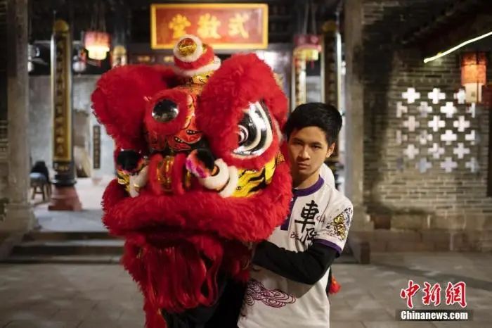 圖為2022年1月18日晚,廣州市天河區車陂龍獅體育會舞獅隊隊員王智銘在晴川蘇公祠拿著一頭紅獅。王智銘是一名“00后”,學習舞獅已3年,他說自己的目標是“世界獅王”。 中新社記者 陳楚紅 攝