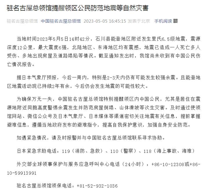 為確保萬無一失,中國駐名古屋總領館特別提醒領區內中國公民,尤其是居住在震源地附近同胞高度警惕余震發生并防范房屋倒塌、山體滑坡等次生災害。及時通過使領館網站、微信公眾號及日本氣象廳、日本媒體等渠道密切關注地震有關信息,提前掌握避難信息,遵循當地政府發布的避難指令,提高自我保護意識,加強自身安全防范。