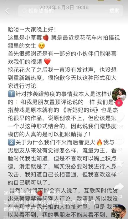 “小草莓老師”也在5月3日發文回應稱,不存在誰是原創的問題。