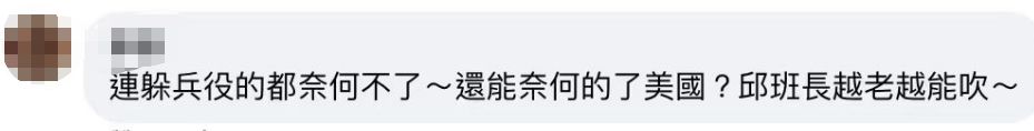 對于如此糊弄且不堅決地表態(tài),民眾留言評論,“全臺灣誰不知道美國想做什么事都是民進黨默許的”“連躲兵役的都奈何不了,還能奈何的了美國?”“先把部隊的問題解決好吧,只會叭叭叭”“嘴巴很厲害,實際跑最快 !”