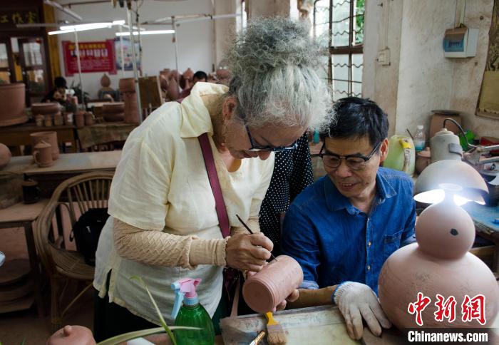 5月16日,臺灣花蓮陶瓷藝人體驗坭興陶雕刻技藝?! ≈行律缬浾? 翟李強 攝