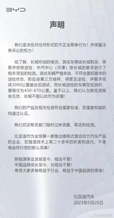 比亞迪稱,經了解,長城所說的情況,測試車輛由長城購買、保管并安排送檢,中汽中心(天津) 按長城的要求進行了相關項目的檢測。測試車輛嚴格來說,不符合國標要求的送檢狀態,即應由第三方抽樣、保管及送檢,并要求完成3000公里磨合后測試,而長城送檢的車輛在檢測時,里程僅為450-670公里。鑒于以上,比亞迪認為其檢測報告無效,長城不能以此作為依據。