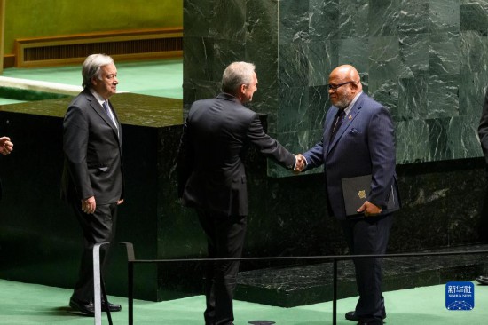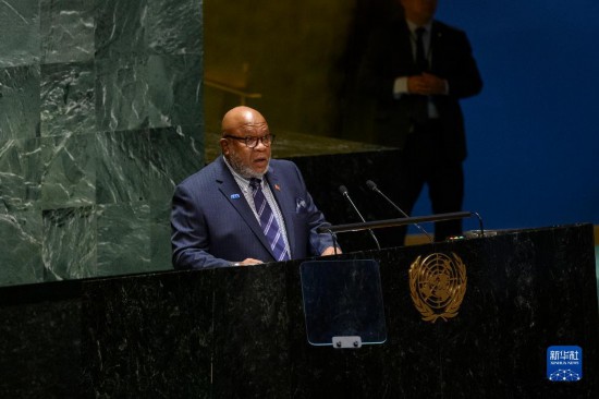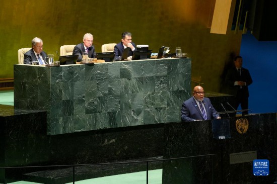 6月1日,在位于紐約的聯合國總部,特立尼達和多巴哥常駐聯合國代表丹尼斯·弗朗西斯(前)當選第78屆聯合國大會主席后發表講話。新華社發(聯合國供圖/洛伊·費利普攝)