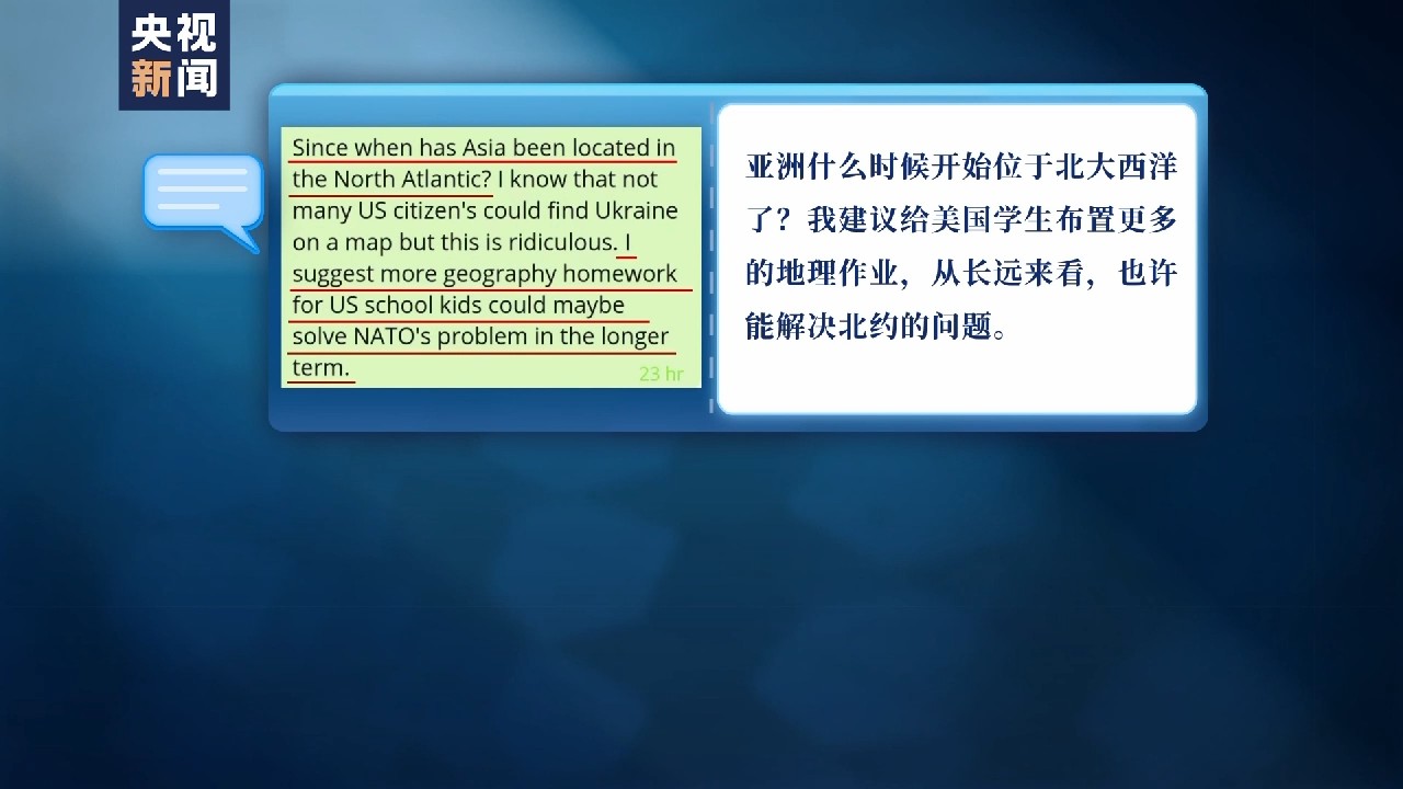 “亞洲什么時候開始位于北大西洋了?我建議給美國學生布置更多的地理作業,從長遠來看,也許能解決北約的問題。”