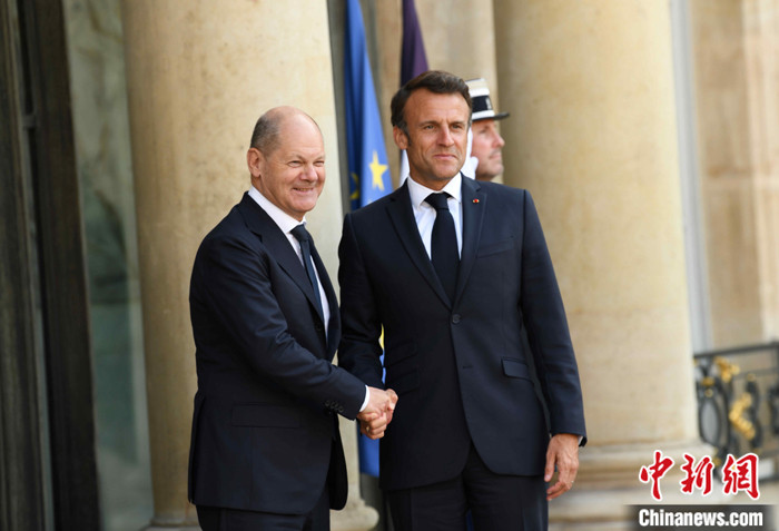 當地時間6月12日晚,法國總統馬克龍在巴黎愛麗舍宮會見德國總理朔爾茨。朔爾茨前來出席當天舉行的法德波三國領導人會談。 中新社記者 李洋 攝