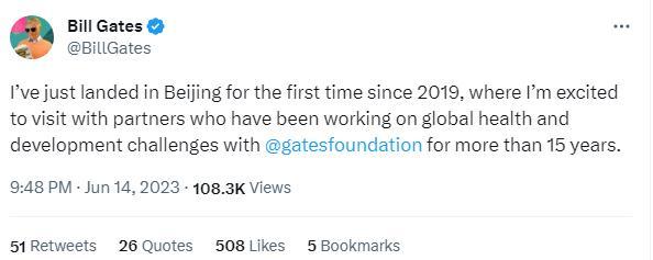 中新網6月14日電 北京時間14日,比爾及梅琳達·蓋茨基金會聯席主席兼理事、美國微軟公司聯合創始人比爾·蓋茨在社交媒體上發文稱已抵達北京。