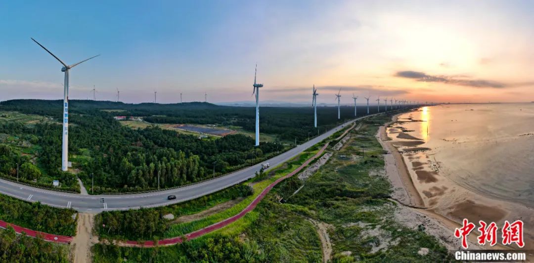 山東省榮成市北環海路,風力發電機與沿海防護林形成一道靚麗的風景線。近年來,中國大力推廣風電產業等“綠色能源”,實現生態保護和可持續發展。楊志禮 攝