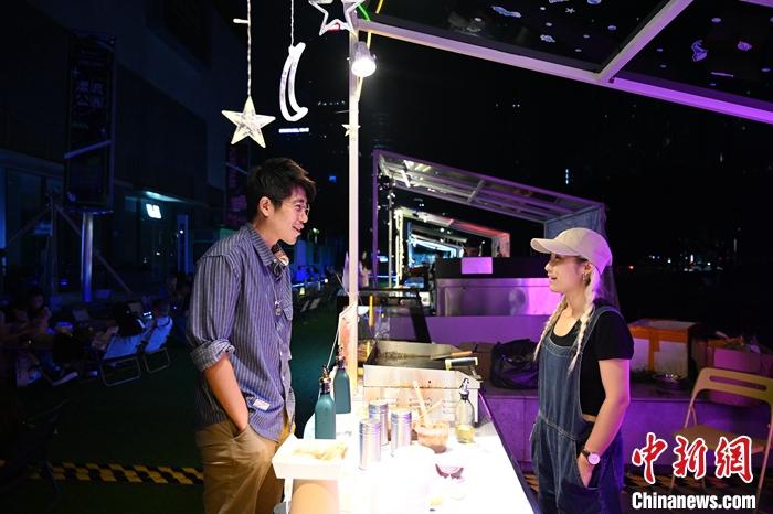 夜幕下的深圳市南山區(qū)人潮涌動(dòng),一處集合了美食、潮流、游戲等元素的市集內(nèi),臺(tái)灣青年周伯彥正與幾位工作人員一起檢查場(chǎng)地布置和物料擺放,為市集營(yíng)業(yè)做最后的準(zhǔn)備。
