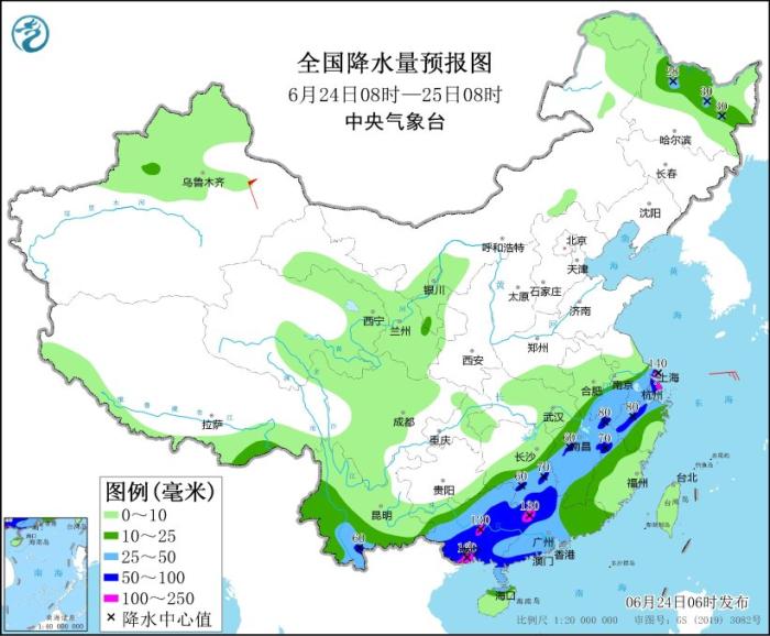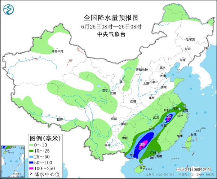 6月24日08時至25日08時,蘇皖南部、上海、浙江北部和西部、福建西北部、江西大部、湖南南部、廣西大部、廣東中西部、云南南部等地部分地區有大到暴雨,其中,江蘇東南部、上海東部、廣西中部和南部沿海、廣東北部等地局部地區有大暴雨(100~160毫米)。
