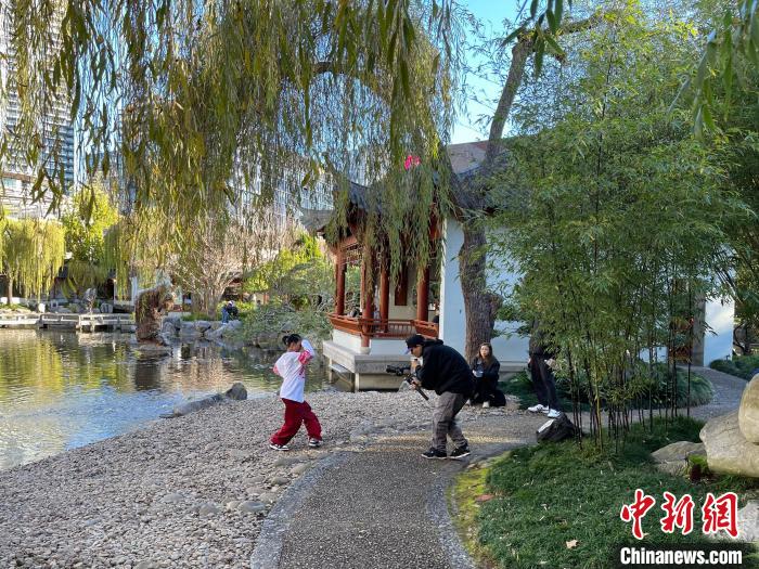 在湖邊,中國戲曲元素結合英文說唱的音樂吸引了游客們駐足。在悉尼從事汽修工作十余年的華人楊女士帶著兒子艾迪在湖邊拍攝音樂短視頻。穿著印有紅色京劇臉譜衛衣的艾迪伴著動感音樂起舞?!拔曳浅O矚g這里中西結合的感覺。希望在公共場合拍攝能培養孩子的自信心?!睏钆空f。