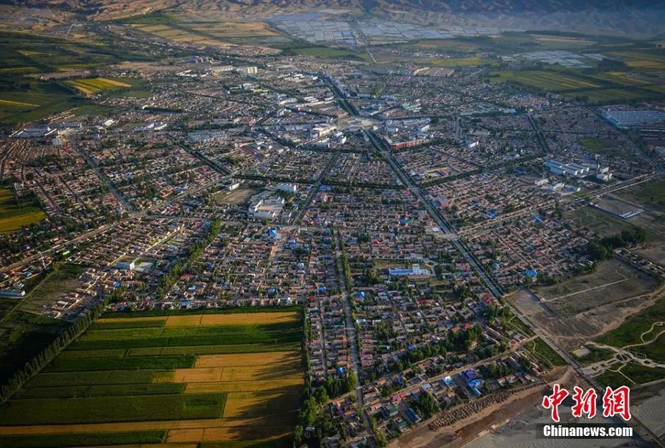 從空中俯拍世界最大規模的八卦城。據介紹,特克斯縣根據《周易》八卦“后天圖”方位設計建成,路路相通,街街相連,有著神奇迷宮般的街道布局,是現今世界上唯一一座保存良好、卦爻完整、規模最大的八卦城。劉新 攝