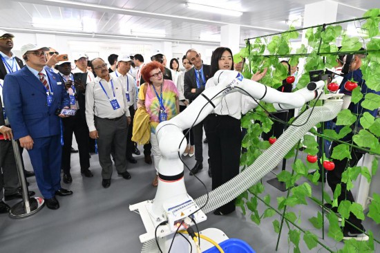 7月6日,駐華使節在國機集團中國農機院觀看番茄采摘機器人作業演示。新華社記者 李鑫 攝