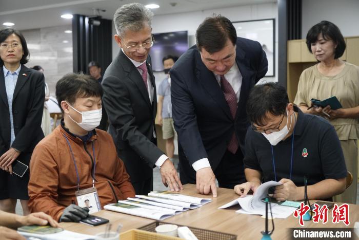 當地時間7日,中國駐韓國大使邢海明赴首爾中國簽證申請服務中心調研。圖為邢海明(左一)考察中心。中新社記者 劉旭 攝