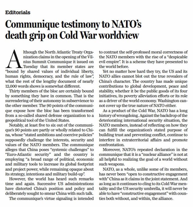 北約維爾紐斯峰會(huì)7月11日發(fā)表萬(wàn)字公報(bào),冠冕堂皇地宣稱(chēng)“堅(jiān)守個(gè)人自由、人權(quán)、民主和法治等共同價(jià)值觀”,實(shí)際上充斥著冷戰(zhàn)思維,炫耀武力,抹黑和攻擊他國(guó)。