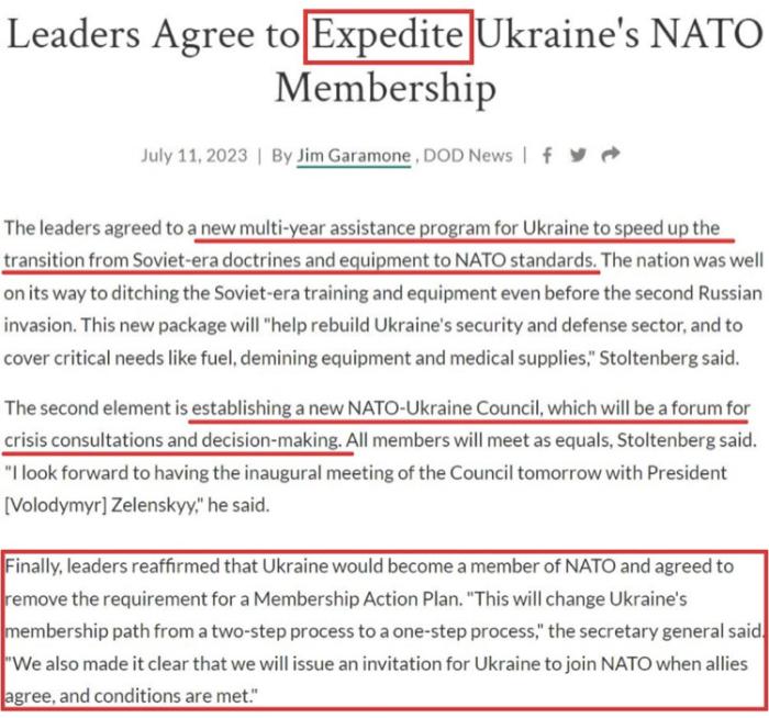 在一片爭吵聲中,北約立陶宛峰會發表的公報確定了一個包含“三要素”的“加快烏克蘭入約計劃”: