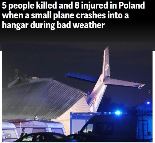 據報道,當天,波蘭國家消防局發言人莫妮卡·諾瓦科斯卡·布林達(Monika Nowakowska-Brynda)表示,“波蘭中部的克辛諾(Chrcynno)地區,受惡劣天氣影響,一架塞斯納型飛機在降落時墜入跳傘中心的機庫,事發時有10人在機庫中,飛行員和在機庫中躲避暴風雨天氣的4名人員遇難。”