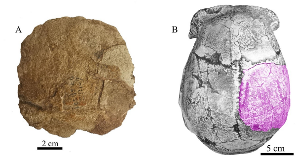 周口店第15號地點發現的人類頂骨化石。左側:頂骨化石外側面觀;右側:周口店直立人頭蓋骨模型頂面觀,示頂骨化石位置。圖片來源:中國科學院官網
